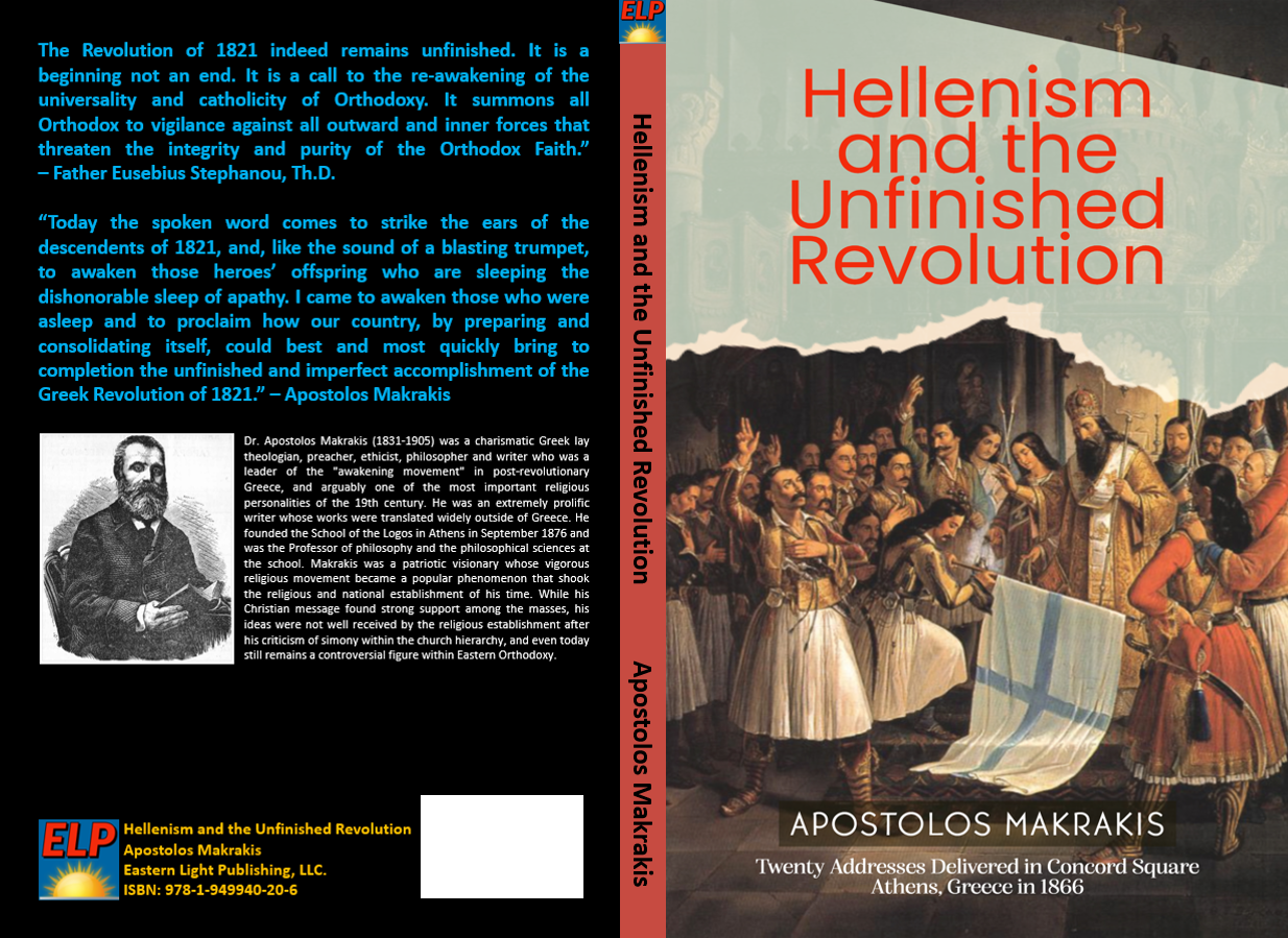 Hellenism and the Unfinished Revolution is a series of twenty addresses delivered by Apostolos Makrakis in Concord Square in Athens Greece in the year 1866. These speeches highlight the early development of his (Eastern Orthodox) Historicist view of the biblical prophecies, and this historical method of interpreting prophecy was expanded further in his full commentary on the Book of Revelation in 1882, The work shows Makrakis was a major proponent of the “Megali Idea” and the restoration of the Byzantine Empire for the young Greek nation. The ideas expressed herein in this work are just as relevant today as they were in the nineteenth century, fully consistent with the prophecies found in the Byzantine Apocalyptic Tradition, which foretell a coming blessed era for the Orthodox faith. Makrakis provides a possible framework to reawaken the spiritual slumber of the Greek nation through the message of the Gospel of our Lord and Savior Jesus Christ to finally achieve the completion of the Greek Revolution which began 200 years ago.