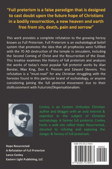 This work by Eastern Orthodox author Lance Conley provides a complete refutation to the growing heresy known as Full Preterism. Full Preterism is an eschatological belief system that promotes the idea that all prophecies were fulfilled with the 70 AD destruction of the temple in Jerusalem, including the Second Coming of Christ and the Resurrection of the Dead. This treatise examines the history of full preterism and analyzes the works of today’s most popular full preterist works by Alan Bondar, Max King, Don K. Preston and Edward Stevens. This refutation is a “must-read” for any Christian struggling with the heresies found in this particular brand of eschatology, or anyone considering joining the full preterist movement due to their disillusionment with Futurism/Dispensationalism. For the latest information on the latest refutations against the Full Preterist heresy, visit the Hope Resurrected blog page: https://www.hoperesurrected.com/.