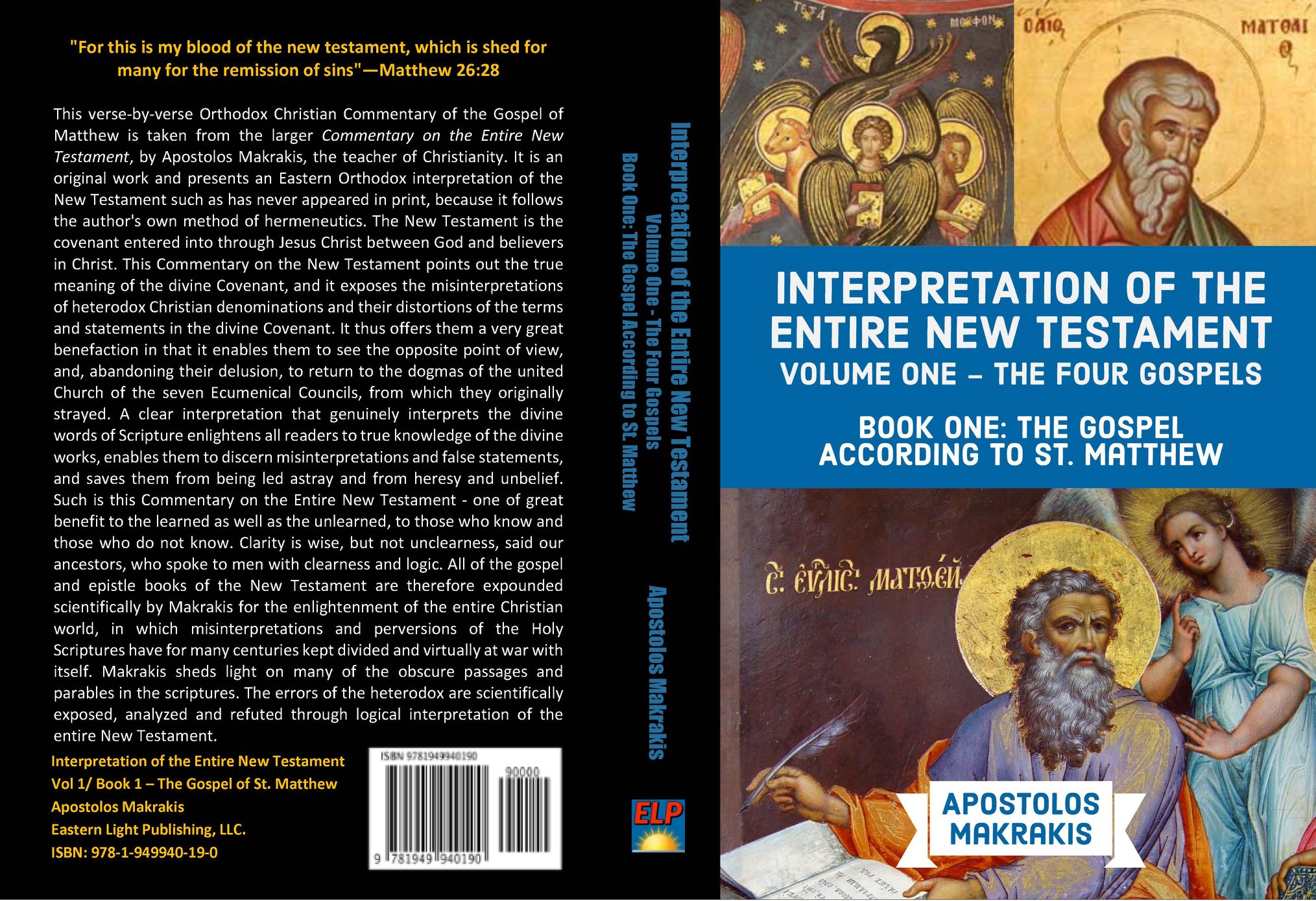 This verse-by-verse Orthodox Christian Commentary of the Gospel of Matthew is taken from the larger Commentary on the Entire New Testament, by Apostolos Makrakis, the teacher of Christianity. It is an original work and presents an Eastern Orthodox interpretation of the New Testament such as has never appeared in print, because it follows the author’s own method of hermeneutics. The New Testament is the covenant entered into through Jesus Christ between God and believers in Christ. This Commentary on the New Testament points out the true meaning of the divine Covenant, and it exposes the misinterpretations of heterodox Christian denominations and their distortions of the terms and statements in the divine Covenant. It thus offers them a very great benefaction in that it enables them to see the opposite point of view, and, abandoning their delusion, to return to the dogmas of the united Church of the seven Ecumenical Councils, from which they originally strayed. A clear interpretation that genuinely interprets the divine words of Scripture enlightens all readers to true knowledge of the divine works, enables them to discern misinterpretations and false statements, and saves them from being led astray and from heresy and unbelief. Such is this Commentary on the Entire New Testament – one of great benefit to the learned as well as the unlearned, to those who know and those who do not know. Clarity is wise, but not unclearness, said our ancestors, who spoke to men with clearness and logic. All of the gospel and epistle books of the New Testament are therefore expounded scientifically by Makrakis for the enlightenment of the entire Christian world, in which misinterpretations and perversions of the Holy Scriptures have for many centuries kept divided and virtually at war with itself. Makrakis sheds light on many of the obscure passages and parables in the scriptures. The errors of the heterodox are scientifically exposed, analyzed and refuted through logical interpretation of the entire New Testament.