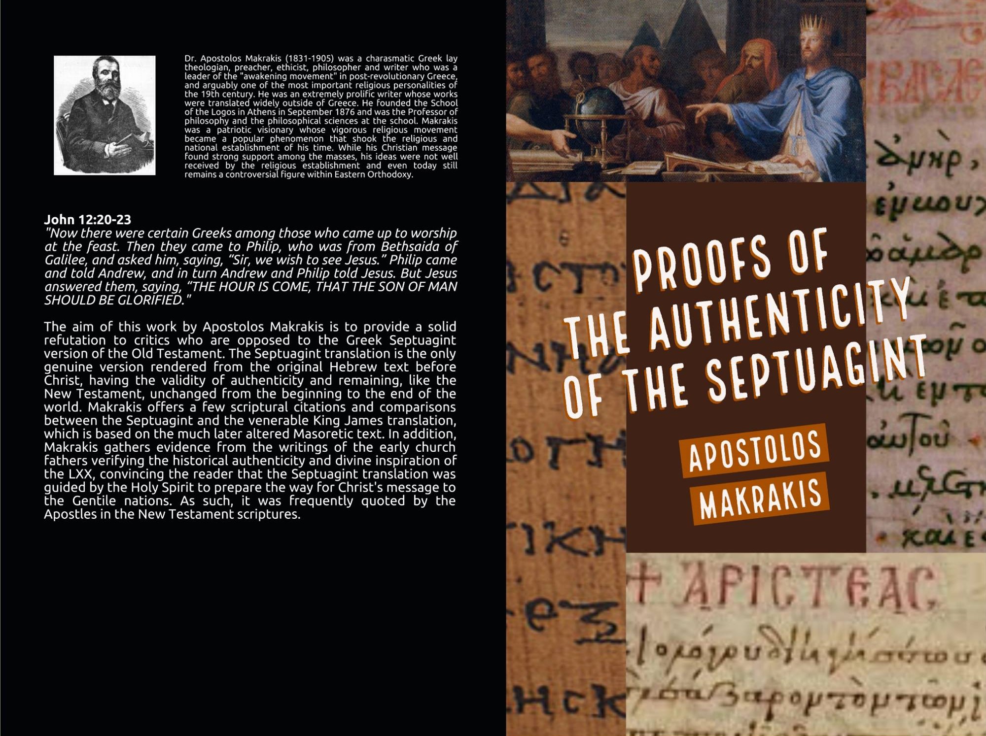 The aim of this work by Apostolos Makrakis is to provide a solid refutation to critics who are opposed to the Greek Septuagint version of the Old Testament. The Septuagint translation is the only genuine version rendered from the original Hebrew text before Christ, having the validity of authenticity and remaining, like the New Testament, unchanged from the beginning to the end of the world. Makrakis offers a few scriptural citations and comparisons between the Septuagint and the venerable King James translation, which is based on the much later altered Masoretic text. In addition, Makrakis gathers evidence from the writings of the early church fathers verifying the historical authenticity and divine inspiration of the LXX, convincing the reader that the Septuagint translation was guided by the Holy Spirit to prepare the way for Christ’s message to the Gentile nations. As such, it was frequently quoted by the Apostles in the New Testament scriptures
